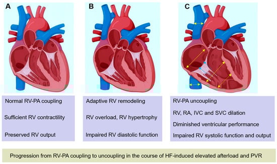 Heart failure (HF) is a life-threatening issue associated with substantial morbidity and mortality, affecting over 56.19 million people worldwide [1]. HF has been categorized into three subtypes based on the left ventricular ejection fraction (LVEF): HF with reduced ejection fraction (HFrEF, LVEF < 40%), mildly reduced ejection fraction (HFmrEF, LVEF between 41% and 49%), or preserved ejection fraction (HFpEF, LVEF ≥ 50%) [2,3]. Right ventricular (RV) function carries substantial prognostic significance in HF, regardless of left ventricular (LV) systolic function [4,5,6]. The right ventricle, being a less muscular chamber, is more sensitive to afterload changes. An elevated left-sided filling pressure caused by LV systolic or diastolic dysfunction is transmitted passively to the pulmonary vessels, resulting in pulmonary hypertension (PH) and subsequent RV dysfunction [7,8]. Right ventricular-pulmonary artery (RV-PA) coupling, defined as the ratio of pulmonary arterial elastance and RV end-systolic function, is a comprehensive parameter that quantitatively indicates the dynamic adaptation of RV systolic function and RV afterload. It has emerged as a stronger predictor of prognosis in HF than other conventional RV function parameters [9,10,11]. In the early stage of PH, the right ventricle undergoes an adaptive response to maintain sufficient cardiac output through contractility enhancement characterized by RV hypertrophy, while RV function remains within the normal range and RV-PA coupling is preserved. However, with progressive PH, right ventricle maladaptive remodeling occurs, featuring chamber dilatation, RV volume increases, RV dysfunction, and even right heart failure [12]. RV-PA uncoupling occurs when the right ventricle fails to generate sufficient contractility to match the RV afterload. Progression from RV-PA coupling to uncoupling in the course of progressively increasing afterload and pulmonary vascular resistance caused by HF is shown in Figure 1. Additionally, RV-PA uncoupling indicates an advanced stage of HF and is a sensitive marker of RV dysfunction [13,14]. Thus, early detection of RV-PA uncoupling plays an important role in both guiding clinical decision-making and predicting prognosis. With the growing interest in RV-PA coupling assessment among HF populations, an increasing number of studies have demonstrated the coupling’s essential impact. In this review, we systematically outline the basic principles and measurements of RV-PA coupling and emphasize its clinical significance in patients with each subtype of HF.