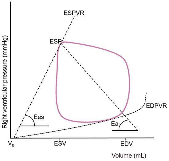 Right ventricular pressure–volume loop from which effective arterial elastance (Ea) and end-systolic elastance (Ees) are derived. EDV: end-diastolic volume; EDPVR: end-diastolic pressure–volume relationship; ESP: end-systolic pressure; ESPVR: end-systolic pressure–volume relationship; ESV: end-systolic volume; V0: hypothetical uncompressed ventricular volume.
