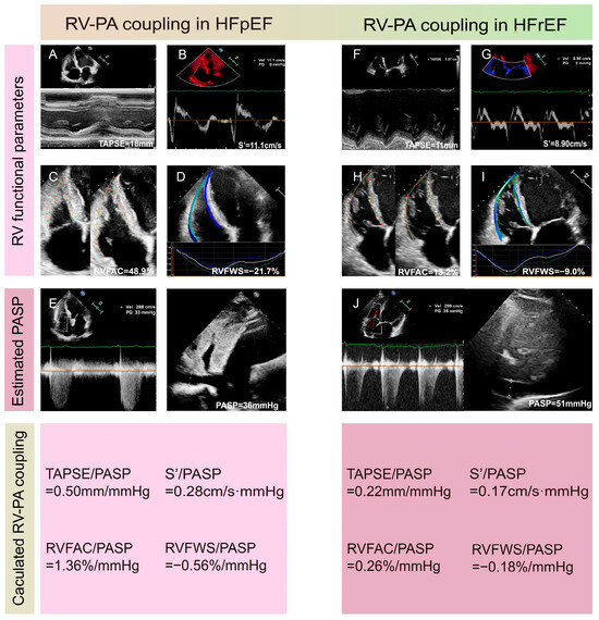 Tricuspid annular systolic plane excursion (TAPSE) is a common RV systolic function parameter in clinical practice. Pulmonary arterial systolic pressure (PASP) can be acquired through echocardiography and is an estimated index of RV afterload. TAPSE/PASP was first introduced as a surrogate marker for Ees/Ea by Guazzi et al. and has been confirmed to closely correlate with RHC-derived Ees/Ea [35,36]. This indicator has become the most frequently used non-invasive surrogate marker in clinical settings, with multiple studies demonstrating its potent prognostic advantage in tricuspid regurgitation (TR), PH, HF, and congenital heart diseases [18,35,36,37,38,39,40]. The prognostic cutoff value of TAPSE/PASP in HF is about 0.36 mm/mmHg but may differ slightly in different studies and diseases [35,41]. Similarly, other RV systolic function parameters in place of TAPSE are used as non-invasive surrogates, such as the tricuspid annular systolic velocity (S’) and RV functional area change (FAC) measured via 2DE, speckle tracking echocardiography-derived RV free wall longitudinal strain (RVFWS) and RV global longitudinal strain (RVGLS), and 3DE-derived RVEF. All of the above-mentioned indices can be divided by the PASP to serve as non-invasive markers of RV-PA coupling, and they demonstrate predictive value for prognosis in clinical applications [42,43,44,45]. Examples of measurements of RV-PA coupling in HFpEF and HFrEF patients using 2DE and speckle tracking echocardiography are presented in Figure 3. Of note, some recent research suggests that RVFWS/PASP may be a better index, with enhanced diagnostic efficacy, highlighting RVFWS/PASP as a promising indicator for future applications [46].