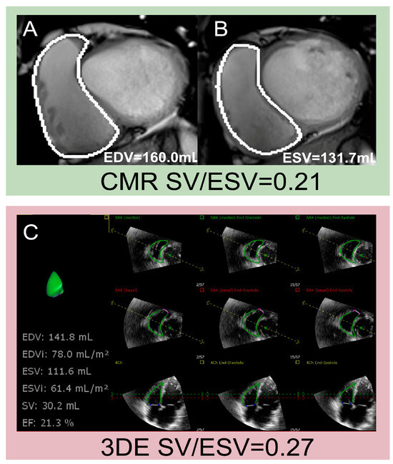 Examples of assessments of SV/ESV using CMR and 3DE. (A,B) Measurement of EDV, ESV, and SV using CMR; (C) measurement of EDV, ESV and SV using 3DE. 3DE: three-dimensional echocardiography; CMR: cardiac magnetic resonance; EDV: end-diastolic volume; ESV: end-systolic volume; SV: stroke volume.