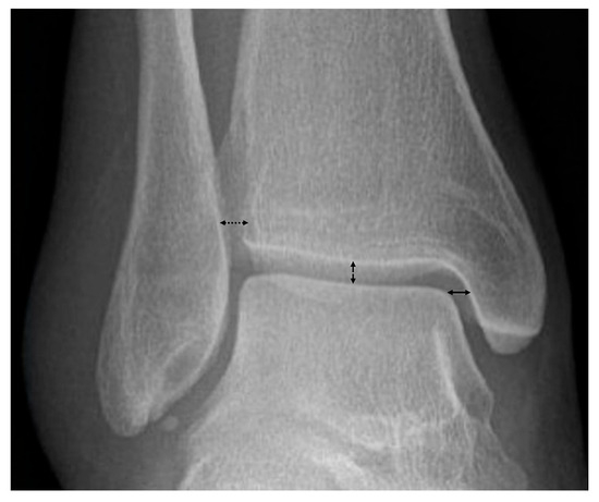 Measurement of the medial, lateral and superior clear space was performed. Measurements were performed on the mortise radiograph. The medial clear space was measured as the distance between the medial border of the talus and the lateral border of the medial malleolus at the level of the talar dome (Figure 4) [39,40]. The lateral clear space was measured as the horizontal distance between the fibular notch and the medial edge of the distal fibula (Figure 4) [39,41]. The superior clear space was measured as the vertical distance from the highest point of the talar dome to the tibial plafond (Figure 4) [42]. All images were reviewed on Picture Archiving and Communication System (Philips IntelliSpace PACS 4.4.541.5, Amsterdam, Netherlands) and displayed on Coronis Fusion 6-megapixel LED Barco monitors (MDCC-6230, Barco NV, Kortrijk, Belgium).