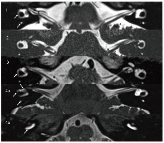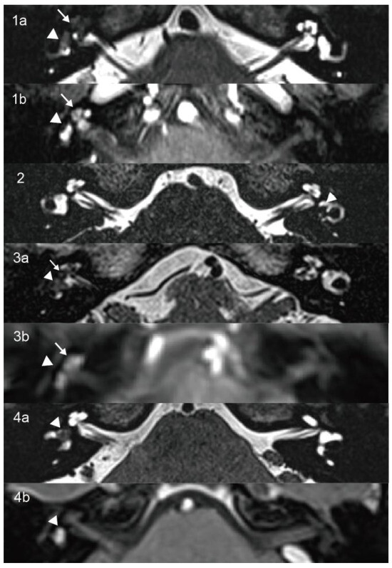 On axial high-resolution T2-weighted MRI (1,3), decreased signal intensity is observed in SCC on the affected side (arrow) compared to the contralateral side. In Case 2 (2), the signal intensity of the cochleae, vestibules, and SCCs appears symmetrical. In Case 4 (4a,4b), axial high-resolution T2-weighted MRI demonstrates decreased signal intensity in the vestibule, SCC, and basal turn of the cochlea on the affected side (arrow) compared to the contralateral side. SCC, semicircular canal.
