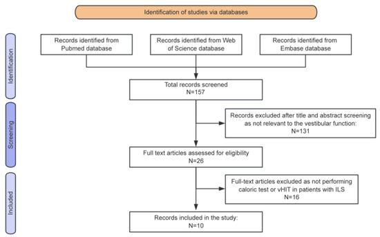 A comprehensive literature review was conducted using the Pubmed, Embase, and Web of Science databases, covering the past 20 years (from 1 January 2005 to 1 March 2025). The primary objective was to identify all studies reporting preoperative vestibular function in patients with ILS. The search terms included: “Intralabyrinthine schwannoma” OR “Intracochlear schwannoma” OR “Intravestibular schwannoma” OR “Intravestibulocochlear schwannoma” AND “vestibular function”. The inclusion criteria were as follows: (i) the article was an original study, not an editorial, letter, or review, and (ii) the study reported imaging-confirmed cases of ILS with vestibular function test using caloric testing or vHIT. The search yielded 26 studies for abstract review, which were assessed subsequently in full-text review. The references of the selected articles were additionally reviewed to identify related studies. Two independent reviewers (C.X. and L.Y.) assessed the original articles and identified 10 articles that met the inclusion criteria. From each study, data were extracted on subtype, clinical presentation, nystagmus, vestibular test results, including caloric testing, vHIT, cVEMP, and oVEMP.