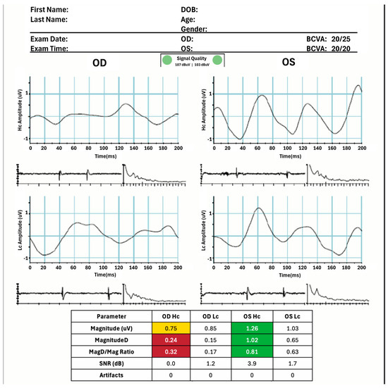 PERG results demonstrating a normal (OS) and an abnormal RGC function (OD). Color coding indicates normal (green), borderline (yellow), and abnormal (red) values.