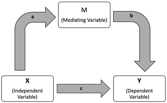 Schematic representation of a mediation models illustrating how an independent variable (X) influences a dependent variables (Y), both directly and indirectly through a mediating variable (M). The path labeled “a” represents the effect of X on M. The paths labeled “b,” represent the effects of M on Y. Both paths “a” and “b” are partial indirect effects. The path labeled “c” represents the direct effect X has on Y.