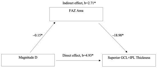 Mediation Analysis: the mediator (M) FAZ area mediating the relationship between MagnitudeD (X) and Superior GCL + IPL Thickness (Y) * p < 0.05. Controlled for CCT and Spherical Equivalent. * p < 0.05.