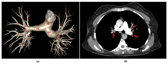 Representative computed tomography pulmonary angiography (CTPA) images illustrating Qanadli scoring and Pulmonary Artery Obstruction Index (PAOI) calculation. (a) A three-dimensional volume-rendered reconstruction of the pulmonary arterial tree based on CTPA, illustrating the principles of Qanadli’s scoring system. Each pulmonary segment is assessed for the presence and extent of embolic obstruction. Segmental arteries are assigned 1 point for partial and 2 points for complete occlusion, while lobar and main pulmonary arteries contribute proportionally based on involved branches. The cumulative score, which has a maximum value of 40, is used to calculate the PAOI, yielding a percentage-based quantification of embolic burden. (b) Axial CTPA image of a 48-year-old female patient who presented to the emergency department with dyspnea. A partial occlusion is observed in the left interlobar pulmonary artery and a complete occlusion in the right interlobar artery (red arrows). The Qanadli score was calculated as 29, corresponding to a PAOI of 72.5%.