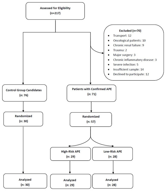 After excluding individuals who met the exclusion criteria, a total of 87 participants were included in the final analysis. Of these, 57 were patients diagnosed with APE and 30 were non-diseased individuals serving as controls. The patient selection process is summarized in the flowchart presented in Figure 2.