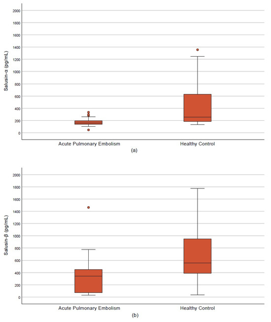 Salusin levels in the acute pulmonary embolism and control groups. (a) Salusin-α. (b) Salusin-β.