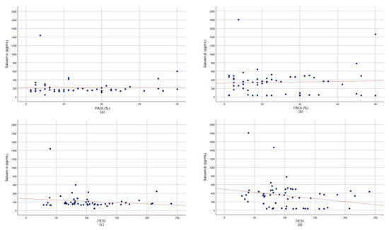 Scatter plots showing correlations of salusin-α and salusin-β with clinical indices. (a) Pulmonary Artery Obstruction Index (PAOI) vs. salusin-α. (b) PAOI vs. salusin-β. (c) Pulmonary Embolism Severity Index (PESI) vs. salusin-α. (d) PESI vs. salusin-β.