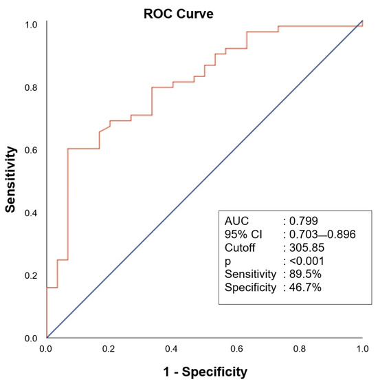 Correlation analyses indicated weak, non-significant trends between both salusin isoforms and PAOI (Figure 4a,b) as well as PESI scores (Figure 4c,d) (p > 0.05). The ROC curve analysis demonstrated that salusin-α had moderate diagnostic accuracy with an AUC of 0.799 (95% CI: 0.703–0.896). The diagnostic performance of salusin-α was evaluated using the ROC curve analysis, and the AUC was found to be 0.799 (95% CI: 0.703–0.896). At a cut-off value of 305.85 pg/mL, the sensitivity and specificity were calculated as 89.5% and 46.7%, respectively. These findings suggest that salusin-α may be a potential biomarker with significant discriminatory power for the diagnosis of APE (p < 0.001) (Figure 5).