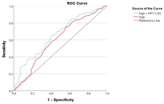 The receiver operating characteristic (ROC) analysis evaluated the predictive accuracy of age alone and the combined model of age plus HPV 16 positivity for the identification of CIN2+ lesions. The area under the curve (AUC) for age was 0.596, with a cut-off value of ≤47.5 years, yielding a sensitivity of 75.1% and a specificity of 42.2%, indicating modest discriminative ability. When HPV 16 status was added to the model, the AUC increased to 0.635, suggesting an improved predictive performance. Although the sensitivity decreased to 36.2%, the specificity significantly increased to 85.1%, demonstrating that the combined model is more effective at correctly identifying true negatives (Group 1). These results imply that HPV 16 positivity enhances the specificity of age-based predictions in detecting high-grade cervical lesions (Table 4).