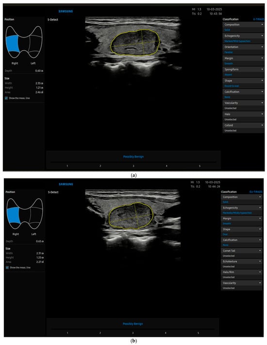 (a) The image shows a thyroid nodule characterized by CAD (S-Detect) as benign (later confirmed cytologically and by follow-up) by using K-TIRADS. (b) The image shows the same thyroid nodule characterized by CAD (S-Detect) as benign by using EU-TIRADS (later confirmed cytologically and by follow-up). (c) The image shows the same thyroid nodule characterized by CAD (S-Detect) as benign by using ACR-TIRADS (later confirmed cytologically and by follow-up).
