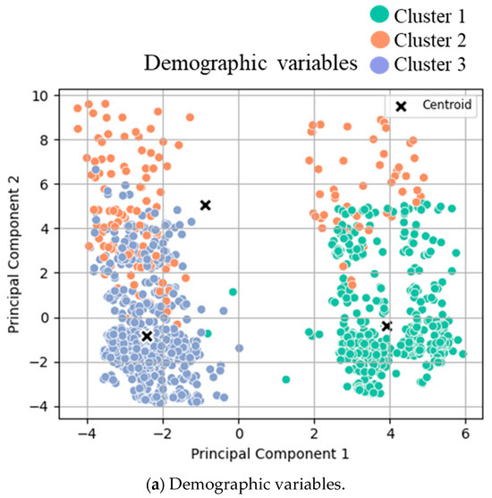To prepare the data for clustering and enhance the performance of the algorithm, we first performed Principal Component Analysis (PCA) on each variable group. This dimensionality reduction technique was implemented for two primary reasons: first, to reduce statistical noise by removing less-informative components, and second, to mitigate the “curse of dimensionality,” where an excessive number of features can degrade the performance of clustering algorithms like K-means. For each analysis, we retained the minimum number of principal components required to explain at least 75% of the total variance in the data.