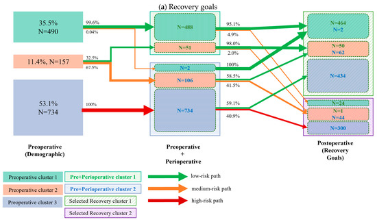 - Perioperative to postoperative transition: Next, we analyzed the transitions from the combined preoperative and perioperative clusters to the final postoperative clusters. This step was performed twice, as the postoperative clusters were independently generated based on two distinct sets of variables: (a) selected recovery goals and (b) clinical outcomes.