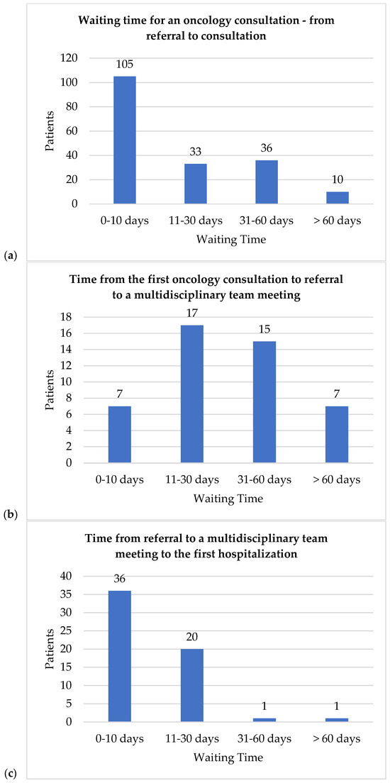 Despite national guidelines aiming for timely care, the study revealed significant challenges. Polish guidelines stipulate a maximum of 7 weeks from specialist consultation to diagnosis and 2 weeks from hospital presentation to treatment initiation [19,20]. Our study found the average time from referral to initial oncology consultation was 18 days, with 60 patients bypassing referrals, indicating variations in patient pathways. Furthermore, an average of 37 days passed between the first oncology consultation and the MDT meeting referral. While the time from the MDT referral to hospitalization and therapy initiation averaged 10 days, the average time to drug program inclusion and surgery was 109 and 94 days post-diagnosis, respectively. Our findings demonstrate that while initial intervals like referral to first oncology consultation and MDT referral/hospital admission to treatment start largely align with existing general guidelines, critical delays emerge later. The prolonged waits from diagnosis to surgery and drug treatment inclusion significantly exceed the spirit of timely care implied by current broad recommendations. This underscores Poland’s lack of comprehensive, clearly defined national standards for all key cancer care waiting times, particularly for specific treatment modalities following diagnosis. Our results strongly suggest an urgent need for the development and implementation of more granular, standardized national guidelines to ensure timely care and facilitate robust comparisons.
