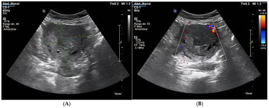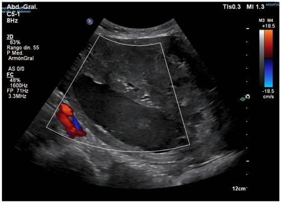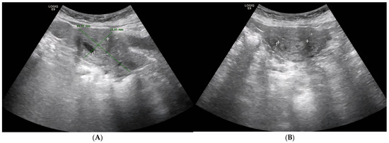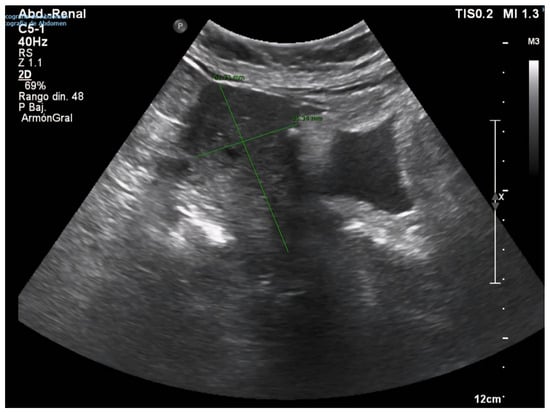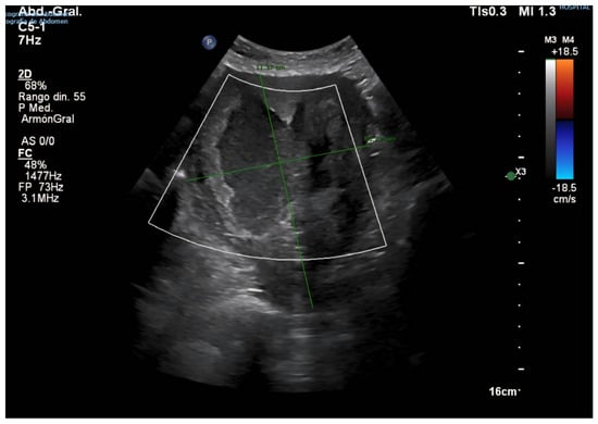 Following this intervention, the patient remained in institutional care, with no reported gynecological symptoms, such as postmenopausal bleeding, pelvic pain, or abnormal discharge. However, progressive uterine enlargement was intermittently noted on annual abdominal ultrasound examinations performed for hepatology follow-up over the subsequent four years (see Figure 2, Figure 3A,B and Figure 4). These findings were not accompanied by targeted pelvic imaging or gynecologic consultation, as the absence of acute or alarming symptoms led to a conservative observational approach by the care team. Consequently, no further endometrial sampling, hysteroscopic assessment, or cross-sectional pelvic imaging was undertaken during this period, and the progressive increase in uterine size was not systematically investigated until the onset of more overt clinical manifestations [20,21].