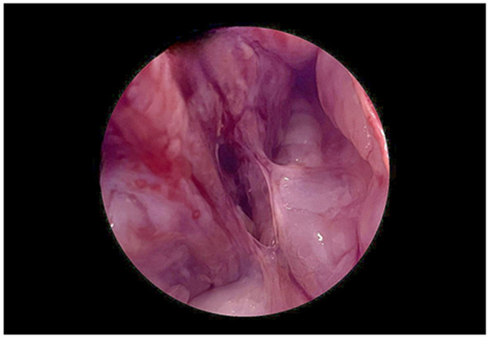 While awaiting definitive characterization of the lesion by pelvic MRI, a diagnostic hysteroscopic evaluation under general anesthesia was undertaken to improve visualization and enable targeted tissue sampling. A giant endometrial polyp measuring approximately 8 cm in maximal diameter was identified, apparently implanted on the anterior wall and uterine fundus (see Figure 6). Concurrent transabdominal ultrasound confirmed an intracavitary mass with poor delineation of the endometrial-myometrial interface. Most of the polyp surface appeared covered by normal epithelium; however, the ability to visualize all surfaces in detail was limited by the size of the lesion and the distortion of the uterine cavity. The posterior endometrial surface was diffusely atrophic except for a whitish, irregular, and vascularized area in the left posterolateral region, which was considered highly suspicious for atypical or neoplastic transformation. Tubal ostia were not visualized. Multiple directed biopsies were obtained using a resectoscope, prioritizing the vascularized area. The procedure was complicated by moderate intraoperative bleeding, which was successfully managed with conservative hemostatic measures. Histopathology reported an endometrial polyp with features suggestive of sarcomatous degeneration, warranting further surgical intervention for complete excision and staging.