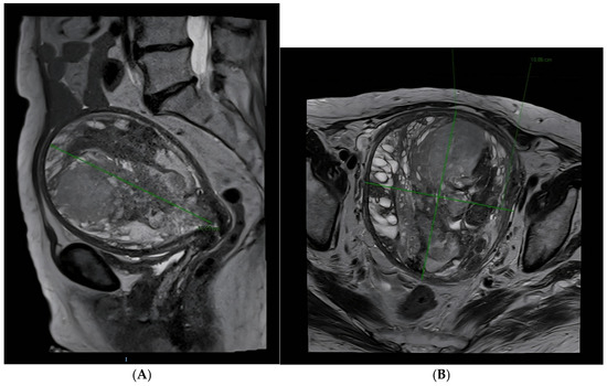 High-field (1.5 T) pelvic MRI with T2 axial, coronal, and sagittal sequences and contrast administration showed a markedly enlarged anteverted uterus with complete endometrial cavity occupation by a heterogeneous mass (12.2 × 10.9 × 13.4 cm) containing cystic and hemorrhagic areas (see Figure 7A,B). No clear base of implantation was identified, nor was the endometrial-myometrial transition clearly delineated, particularly along the left posterolateral side. The lesion showed restricted diffusion and marked contrast enhancement, extending to the internal cervical os. No significant lymphadenopathy was observed. Cervix, vagina, and adjacent organs appeared unremarkable. A small amount of free fluid was present. Visualized osseous structures were normal [22].
