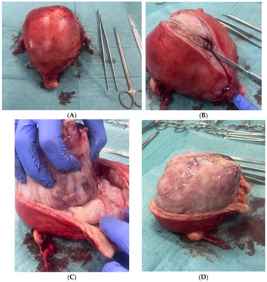 ((A): Surgical specimen. (B–D): Dissection of the specimen, cutting at the myometrial level) Macroscopic examination of the total hysterectomy. Specimen, received opened, shows a markedly enlarged uterus measuring 13.5 × 13 × 9 cm. The endometrial cavity is completely occupied by a large intracavitary mass measuring approximately 10 cm in diameter, with gross features suggestive of sarcomatous transformation. The mass displays a lobulated, heterogeneous surface with areas of hemorrhage and necrosis. The cut surface reveals alternating solid and cystic regions composed of tan-white fleshy tissue interspersed with hemorrhagic zones, consistent with a giant endometrial polyp showing features suspicious for sarcomatous degeneration. No obvious myometrial invasion is identified on gross inspection. The left adnexa includes an ovary measuring 2 cm and a fallopian tube of 5 cm; the right adnexa similarly consists of a 2 cm ovary and a 5 cm fallopian tube, both without gross abnormalities.
