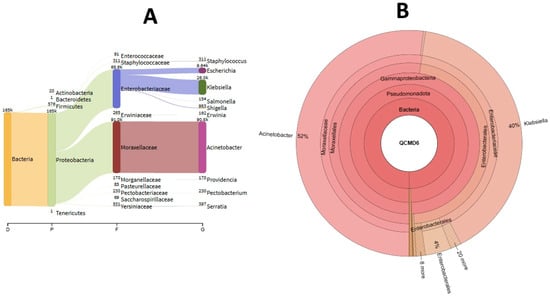 For the RDP11.5 database, QCMD1 was also identified as Serratia, with 90,122 (93.03%) reads. QCMD7 was identified as a mixture of two bacteria, Klebsiella with 5054 (29.05%) reads and Enterobacter with 3287 (18.9%) reads. The QCMD6 was identified as a single bacterium, Acinetobacter, with 23,369 (69.72%) reads.