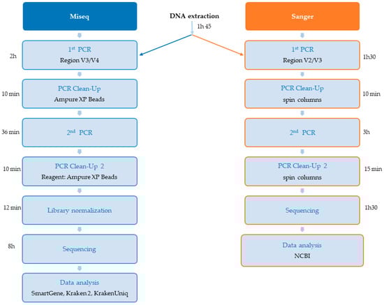 The total time for library preparation was 3 h 8 min for MiSeq and 4 h 45 min for Sanger. The sequencing time was 8 h for MiSeq and 1 h 30 min for Sanger.
