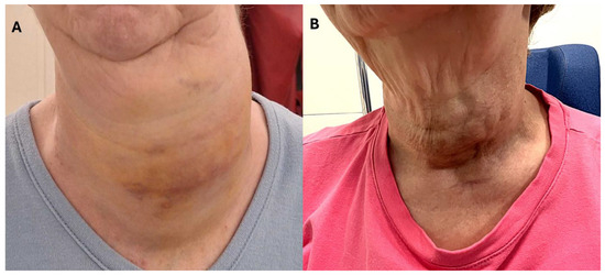 (A) A clinical photograph of the patient’s neck showing a firm, left-sided cervical mass measuring approximately 12 cm in its greatest dimension, with overlying skin retraction, ecchymotic discolouration, and prominent dilated superficial veins and telangiectasias. (B) A follow-up image (end-of-treatment) demonstrating marked regression of the indurated mass to around 3 cm, with only subtle skin retraction remaining.