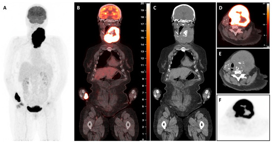 Baseline [18F]-fluorodeoxyglucose positron emission tomography/computed tomography ([18F]FDG-PET/CT) images. The whole-body maximum intensity projection (MIP, A) image shows a large left mass area of abnormal tracer uptake in the neck and normal tracer distribution in the rest of the body. Coronal (B,C) and axial (D–F) merged PET/CT section shows gross enlargement of the thyroid gland with a necrotic centre, calcifications, and displacing trachea to the right with no evidence of compression or infiltration. The mass predominantly involves the left thyroid lobe along with part of the isthmus. Intense [18F]-FDG uptake (SUVmax 19.4) in the peripheral part of the thyroidal mass is seen with no tracer uptake in the necrotic centre (B,D,F).