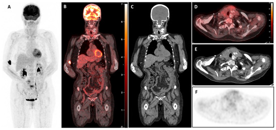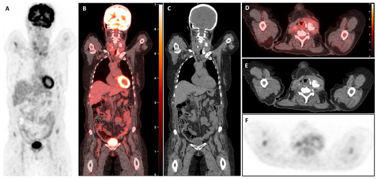 Interim [18F]FDG-PET/CT (iPET) images after two cycles of chemotherapy. The whole-body MIP (A) image shows a normal distribution of tracer throughout the body, associated with diffuse axial and appendicular skeletal activity of reactive nature, and a substantial absence of significant tracer activity in the neck. Coronal (B,C) and axial (D–F) unenhanced CT images of the neck reveal significant reduction in the size of the thyroid gland with calcifications in the left thyroid lobe (craniocaudal dimension from 14 cm to 10 cm). Subsequent [18F]FDG-PET/CT images show diffuse [18F]-FDG uptake in the residual thyroidal mass (SUVmax 3.0) less than hepatic uptake (SUVmax 3.1), suggestive of a complete metabolic response (Deauville score of 3).