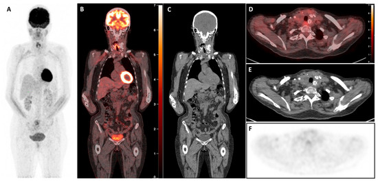 End-of-treatment [18F]FDG PET/CT showed normal tracer distribution on the whole-body MIP image (A), with no significant pathological uptake in the residual thyroid mass. The lesion demonstrated an SUVmax of 2.9, which was lower than hepatic uptake (SUVmax 3.3) but higher than the mediastinal blood pool (SUVmax 1.9), consistent with a complete metabolic response (Deauville score 3). (B,C) and (D–F) are coronal and axial images, respectively. B and D are PET and CT fused images.