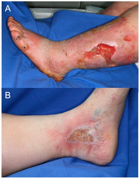 Example images of (A) an arterial ulcer and (B) a venous ulcer of the lower extremities.