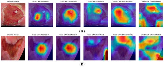 Grad-CAM visualizations for ulcer classification. (A) Venous ulcer; (B) Arterial ulcer: representative original images (far left) and Grad-CAM outputs for five different DL models: ResNet50, ResNeXt50, ConvNeXt, EfficientNetB2, EfficientNetV2 (from left to right). Red and yellow areas indicate regions highly relevant to the model decision, while blue and purple areas are less relevant.