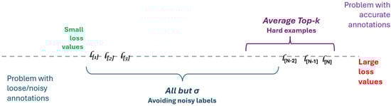 Here, by choosing , the ”Average Top-k” from Equation (3) is retrieved. If , the smallest k losses are used, retrieving the so-called Average Bottom-k () [16]; yet, to our best knowledge, the later has only been formulated and not been used on a practical application. The formulation may be seen as a top-bottom simultaneous selection. We emphasize the following ideas, which are also illustrated in Figure 2: