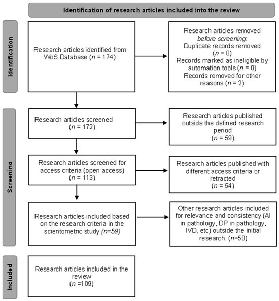 After the research was performed through Web of Science, inclusion and exclusion criteria were used to include articles in the defining research direction process as shown in the Figure 2. Beside the included articles from the research performed, several articles were included for the relevance of the review (AI in pathology, DP in pathology, IVD, etc.) from other databases (Figure 2).