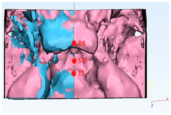 The STLs of the “unhealthy side” (selected as “reference”) underwent point-based superimposition into the “healthy side” (selected as “test”) using three median landmarks: the tuberculum sellae (TS), the sella turcica floor (STF), and the dorsum sellae (DS).