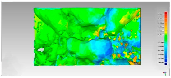 Following the point alignment process, the “best fit” and then the “3D comparison” functions were used, which the software uses to compare the surface of the “reference” model with that of the “test” model, calculating the differences point by point. The RMS was used to assess the three-dimensional displacement between the “test” and “reference”. A low RMS value indicates a high similarity between the “test” and “reference”.
