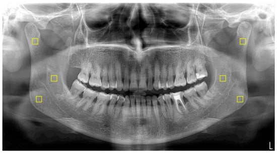 ROIs selected from the right and left condylar, mid-ramus, and angulus bone areas in a panoramic image. The ROIs are highlighted with yellow squares.