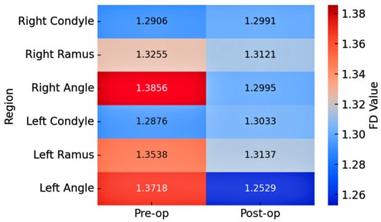 Heatmap illustrating the mean FD values of mandibular regions in bruxism patients before and after BTX-A treatment. Warmer colors represent higher FD values, while cooler colors indicate lower values. Notable reductions are observed in the right and left angulus regions post-treatment, consistent with the statistical analyses.