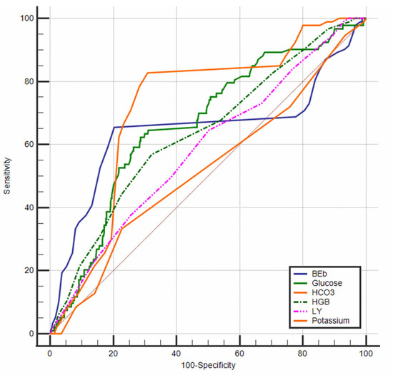 An ROC analysis was also performed to determine the discriminative power of the variables included in the logistic regression model in distinguishing between mortality and ROSC (Figure 2). The analysis revealed that actual HCO3 values ≤ 19 mmol/L demonstrated a moderate level of discriminative power (AUC = 0.720, p < 0.0001). Similarly, when a threshold value of −18 was used, the variable BE (AUC = 0.647, p = 0.0002), as well as glucose levels > 205 mg/dL (AUC = 0.665, p < 0.0001), also showed moderate discriminative ability in identifying the ROSC status.
