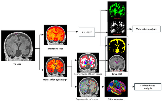 - Zöllei, L.; Iglesias, J.E.; Ou, Y.; Grant, P.E.; Fischl, B. Infant FreeSurfer: An automated segmentation and surface extraction pipeline for T1-weighted neuroimaging data of infants 0–2 years. NeuroImage 2020, 218, 116946. [Google Scholar] [CrossRef]