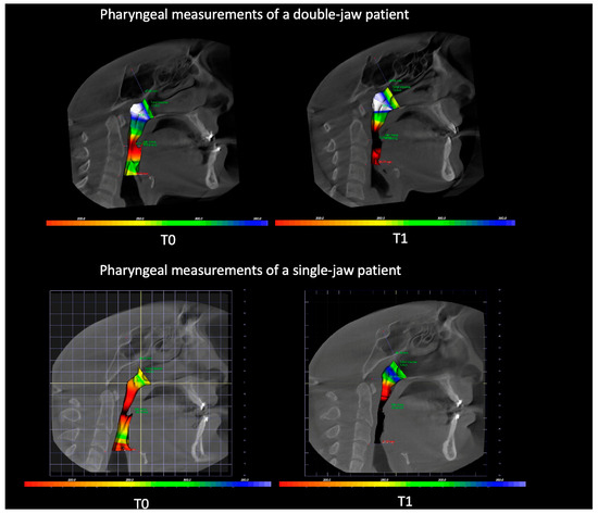 Table 2 shows the volumes of the oropharynx, nasopharynx, and total airway before and after orthognathic surgery. In the double-jaw group, oropharyngeal volume decreased from 17,097 ± 5675 mm3 at T1 to 14,290 ± 5835 mm3 at T2; however, this reduction was not statistically significant (p = 0.017). In contrast, nasopharynx volume significantly increased from 5316 ± 1948 mm3 to 6064 ± 1899 mm3 (p = 0.010). Total airway volume decreased from 25,741 ± 9195 mm3 to 22,164 ± 6262 mm3; however, this change did not reach statistical significance (p = 0.075). PAS values and minAx significantly decreased postoperatively in the double-jaw group (p = 0.002 and p = 0.001, respectively). Similarly, in the single-jaw group, oropharynx volume decreased significantly from 15,620 ± 5040 mm3 to 12,444 ± 4701 mm3 (p = 0.010), while nasopharynx volume did not show a significant change (p = 0.551). Total airway volume significantly decreased from 20,452 ± 7754 mm3 to 16,846 ± 6529 mm3 (p = 0.010), and PAS and minAx exhibited significant postoperative reductions (p = 0.000 for both). In addition to statistical significance, Cohen’s d values were calculated to assess the clinical relevance of volumetric changes. In the single-jaw group, a large effect was observed for PAS (d = 1.213), while moderate effects were noted for oropharynx volume (d = 0.652), total airway volume (d = 0.503), and minAx (d = 0.633). In the double-jaw group, the reduction in PAS also demonstrated a large effect (d = 0.866), whereas changes in oropharynx and total airway volumes showed moderate effects (d = 0.488 and 0.455, respectively). An increased nasopharyngeal volume in the double-jaw group showed a small-to-moderate effect size (d = 0.389).