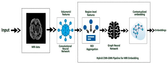 - Hybrid CNN–GNN for MRI Embedding: Extracts volumetric features using a CNN and models brain-region interactions with a GNN to capture contextual structural representations.