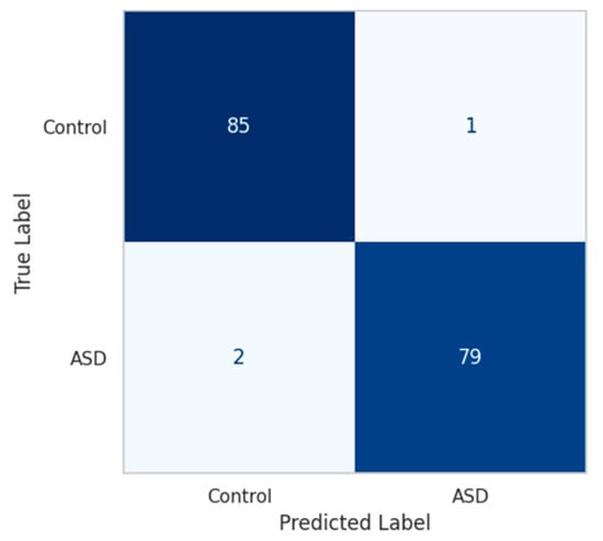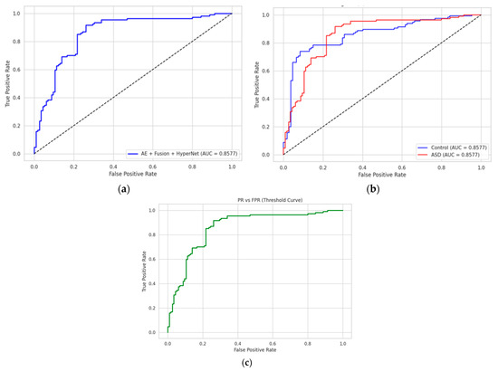 We further computed class-wise ROC curves, visualized in Figure 5b. For the ASD class, the true-positive rate (TPR) exceeds 0.996 at a false-positive rate (FPR) below 0.01, while the control class maintains a TPR of 0.993 under the same FPR. This demonstrates the model’s stability in minimizing both false alarms and missed diagnoses.