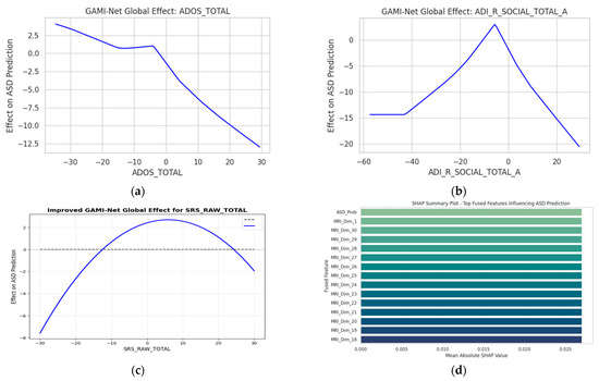 Here, represents the marginal contribution of individual features, while captures interaction terms (e.g., ADOS_Total × Age). This allows clinicians to directly visualize how an increase in, say, ADOS-Gotham_Total or ADI_R_RRB_Total_C, elevates the predicted ASD probability. The top behavioral contributors are shown in Figure 7a–c. The top MRI_Dim_# features in Figure 7d correspond to latent embedding dimensions derived from the MRI encoder, which primarily capture variations in the frontal and temporal lobes; we have now explicitly described these to aid interpretability.