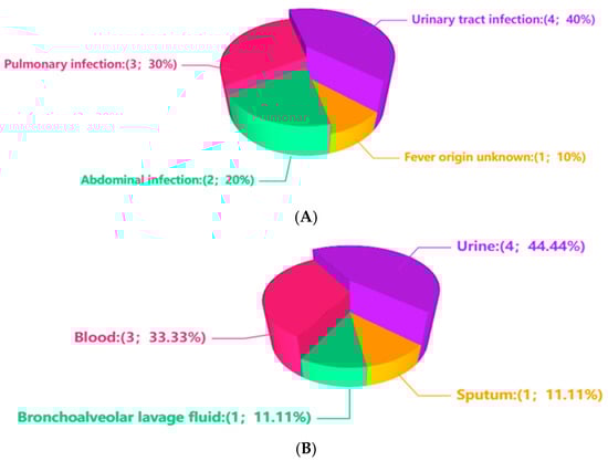 Infection sites and specimen types. (A) shows the infection site among the 9 cases. (B) shows the specimen type among the 9 samples.