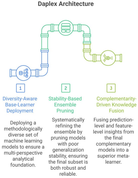 The DAPLEX framework conceptualizes the diagnostic task as a structured, three-phase pipeline. The process begins with the deployment of diverse base learners drawn from distinct ML families to capture heterogeneous diagnostic signals. These learners are then subjected to rigorous evaluation procedures to assess their predictive accuracy, generalizability, and mutual complementarity. In the final phase, a meta-learner integrates the ensemble’s collective outputs through a structured fusion mechanism that combines probabilistic predictions and feature-level insights into a unified meta-representation. The technical implementation of each phase is detailed in the following subsections. The entire analytical workflow was implemented in Python (version 3.12.3; Python Software Foundation, Wilmington, DE, USA) using the scikit-learn library (version 1.6.1), the pandas library (version 2.2.2), the XGBoost library (version 2.1.4), the NumPy library (version 1.26.4), the SciPy library (version 1.13.1), the Matplotlib library (version 3.9.2), and the Seaborn library (version 0.13.2).