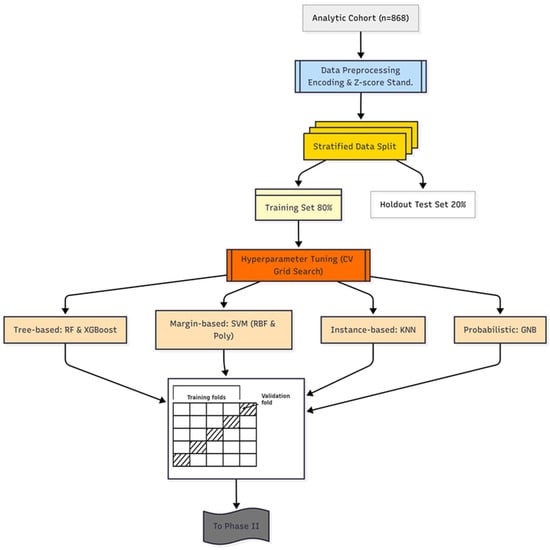 Phase I of the DAPLEX framework is grounded in the principle of diversity-aware ensemble design. This strategy, widely acknowledged for its ability to enhance generalization, promotes algorithmic heterogeneity to capture complementary diagnostic patterns that may be missed by homogeneous models [,,]. Accordingly, six base classifiers were selected to represent distinct learning paradigms, including tree-based ensembles (bagging and boosting), margin-based geometric models, instance-based learners, and probabilistic classifiers. The rationale for each selection was based on a combination of established theoretical diversity and empirical evidence of strong performance in similar clinical prediction tasks.