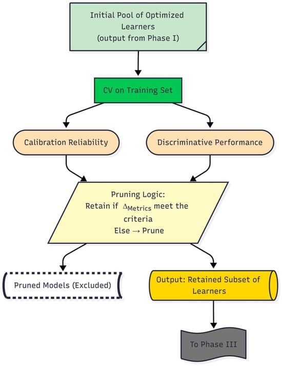 Through this step, the remaining subset of models that satisfied the stability criterion was retained for subsequent integration. These selected models form the core ensemble candidates for Phase III. A schematic overview of the Phase II workflow is presented in Figure 3, which outlines the critical pruning mechanism that establishes a high-confidence foundation for the final stage of the DAPLEX framework—complementarity-driven knowledge fusion.