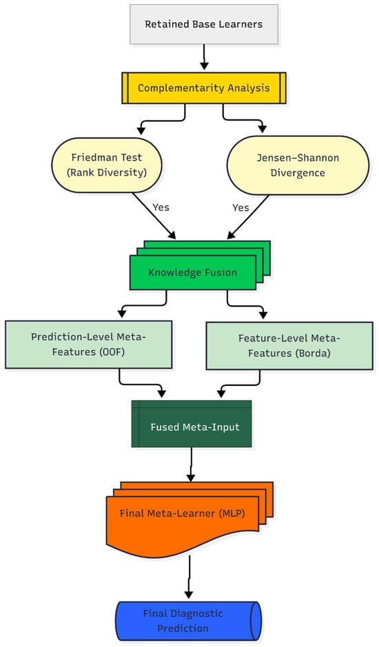 Phase III: Complementarity-Driven Knowledge Fusion: In the final phase, a meta-model is constructed by integrating probabilistic predictions and feature-level insights from the pruned ensemble. Model complementarity is formally quantified to guide this integration, resulting in a final decision that is both robust and clinically meaningful.