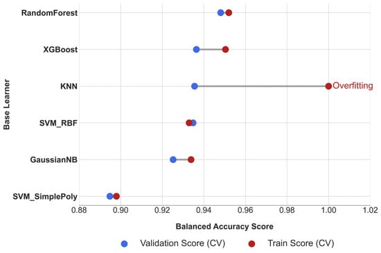 To complement the numerical results, the dumbbell plot in Figure 5 illustrates the ΔBA, with larger gaps indicating a higher risk of overfitting. The plot clearly identifies KNN as an outlier, with a stability gap exceeding the predefined threshold (ΔBA = 0.0645). Consistent patterns across other metrics are provided in Supplementary Figure S1, further supporting this finding.